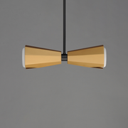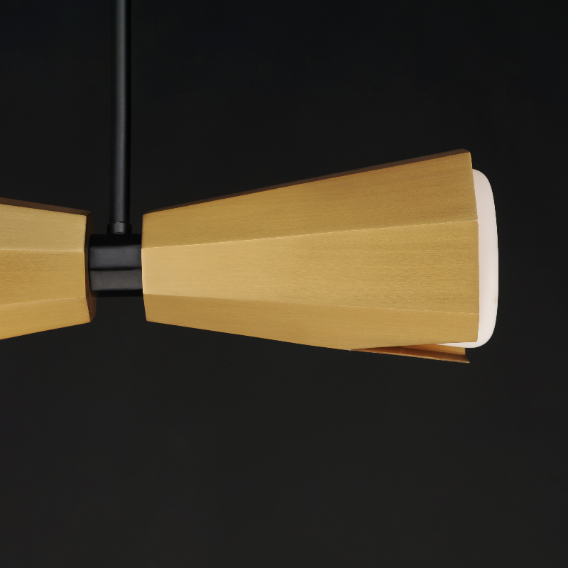 The Rizzo collection exudes stylish flair and spirited design, combining faceted metal shades in Natural Aged Brass with striking Matte Black accents. A flat-bottomed Satin White glass shade protrudes gracefully from the base of each metal shade, delivering soft, inviting light with a touch of elegance.
