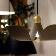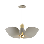 Incurved metal petals of Storm Grey or White finish with Satin Brass caps make oversized biophilic light fixtures. Available as wall sconces or pendants, the various configurations provide playful forms both nostalgic or youthful. Pair with a white G25 lamp or reflector lamp to complete the look.