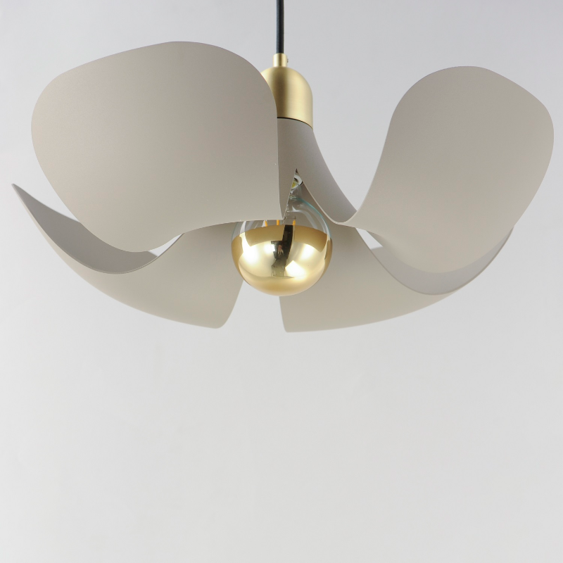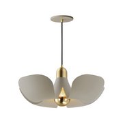 Incurved metal petals of Storm Grey or White finish with Satin Brass caps make oversized biophilic light fixtures. Available as wall sconces or pendants, the various configurations provide playful forms both nostalgic or youthful. Pair with a white G25 lamp or reflector lamp to complete the look.