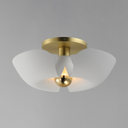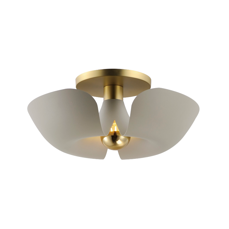 Incurved metal petals of Storm Grey or White finish with Satin Brass caps make oversized biophilic light fixtures. Available as wall sconces or pendants, the various configurations provide playful forms both nostalgic or youthful. Pair with a white G25 lamp or reflector lamp to complete the look.
