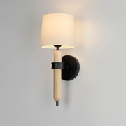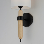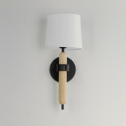 Natural White Oak wood details are featured plainly on a slim Matte Black metal frame. Oversized off-white linen shades cover sockets for a minimalist and natural look. Available in multiple configurations of chandelier and a wall sconce.