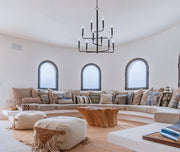 A modern interpretation of wrought iron chandeliers, the Madeira collection evokes the spirit of Spanish and Portugese coastal cities. Articulating arms finished in a textured Anthracite finish create a cascading candelabra concept with Clear Textured glass bobeches.