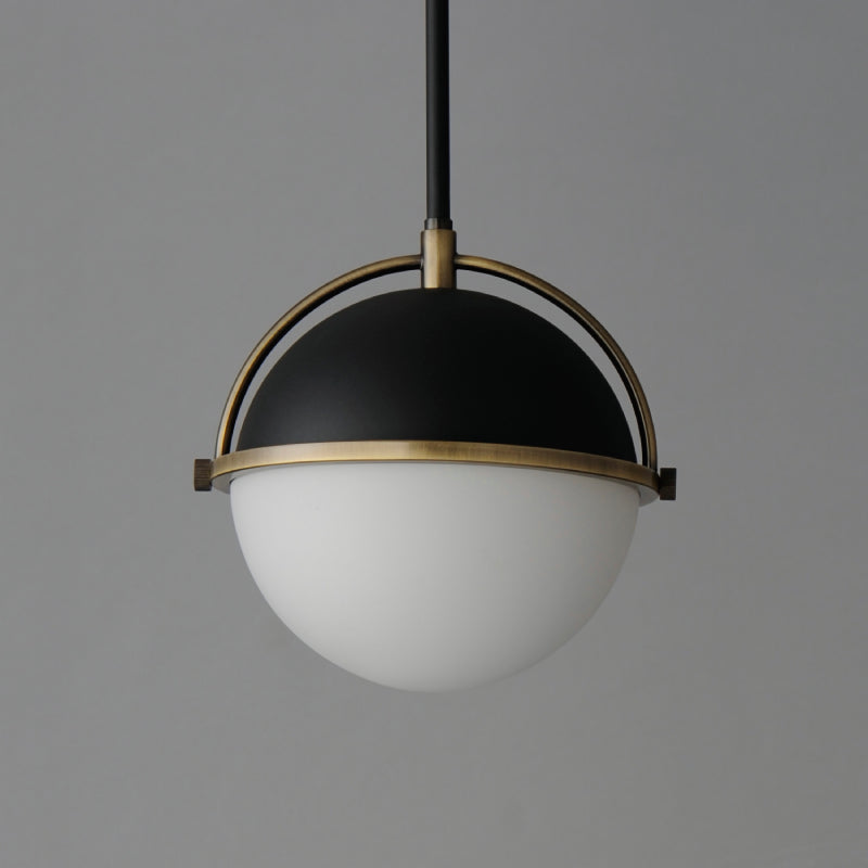 Tasteful globes constructed of metal and glass halves are combined and suspended by an arc-shaped yoke structure. The top dome of robust steel support lower halves of Satin White glass shades that twist lock on for convenience of installation and maintenance. This attractive design is sure to enhance your projects most needed spaces with an enduring appeal to the design that works in a variety of aesthetics.