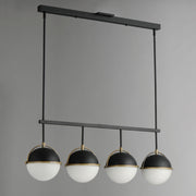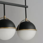 Tasteful globes constructed of metal and glass halves are combined and suspended by an arc-shaped yoke structure. The top dome of robust steel support lower halves of Satin White glass shades that twist lock on for convenience of installation and maintenance. This attractive design is sure to enhance your projects most needed spaces with an enduring appeal to the design that works in a variety of aesthetics.
