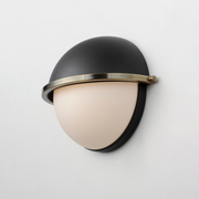 Tasteful globes constructed of metal and glass halves are combined and suspended by an arc-shaped yoke structure. The top dome of robust steel support lower halves of Satin White glass shades that twist lock on for convenience of installation and maintenance.