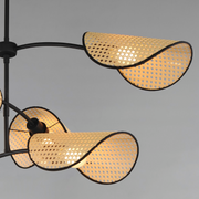 Natural cane woven wicker shades curve over exposed light bulbs like the brim of a bonnet on a minimalistic mobile chandelier. The composition of shade and chandelier shape are of a corresponding curvature. The contrast of natural materials and sandy Black silhouette of chandelier form adds nostalgia to an overall modern design. The shades are rotatable under another axis of articulation allowing more flexibility in the design according to your preference.