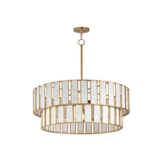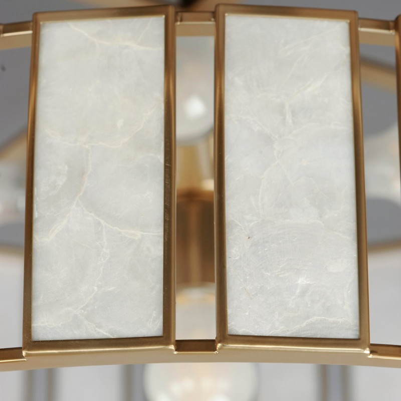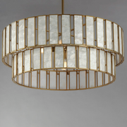 Classic in form and evoking the sea, laminae of Capiz shell are framed in paneled drum shapes. The Natural Aged Brass finish refines the coastal elements and complements the warm glow from behind the translucent panels.