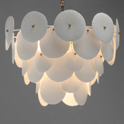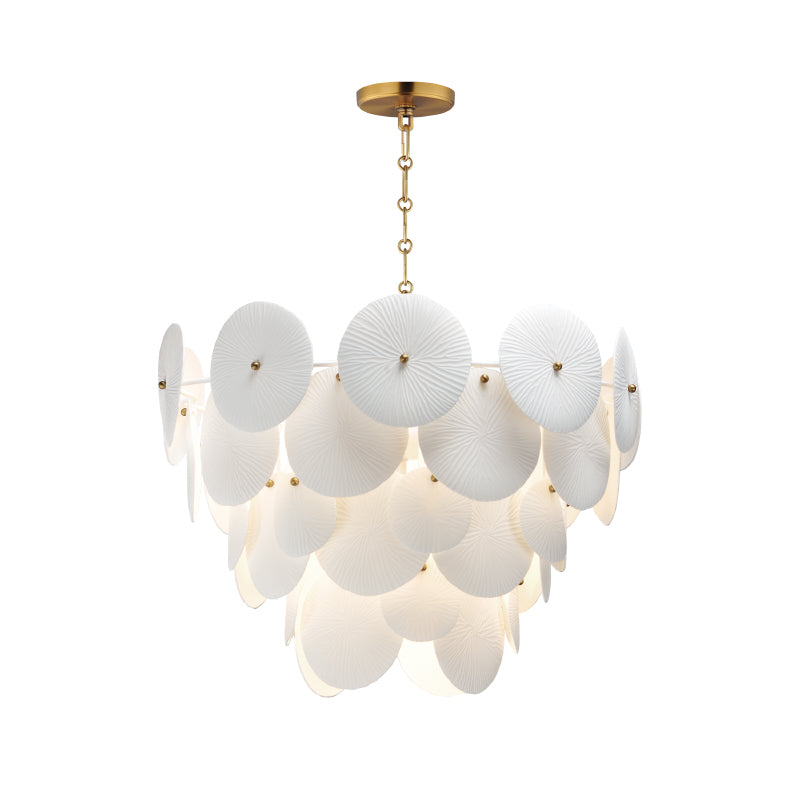 Featuring suspended tiers of textured, translucent ceramic panels, this design softly diffuses light across an undulating Matte White frame.
