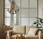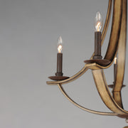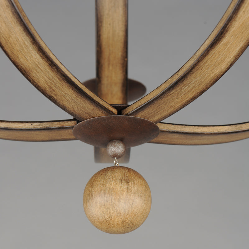 The timeless Empire chandelier shape styled in timeworn, natural finishes uses durable steel in a Driftwood finish that includes a spherical ornament in matching finish. The arms curve steeply, swept lower than the chandelier's center, emphasizing the chandelier's height while mitered angles at its top accentuate the thickness of the barrel-like planks. Exposed candelabra lamps on Anthracite candle covers adding texture and contrast. The result of the organic wood tones reduces the formality of the classical shape making the elegance of this design more inviting.