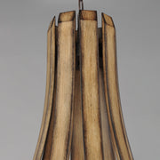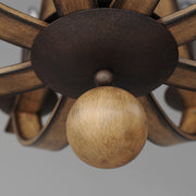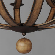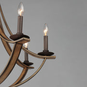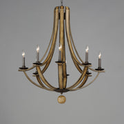 The timeless Empire chandelier shape styled in timeworn, natural finishes uses durable steel in a Driftwood finish that includes a spherical ornament in matching finish. The arms curve steeply, swept lower than the chandelier's center, emphasizing the chandelier's height while mitered angles at its top accentuate the thickness of the barrel-like planks. Exposed candelabra lamps on Anthracite candle covers adding texture and contrast. The result of the organic wood tones reduces the formality of the classical shape making the elegance of this design more inviting.