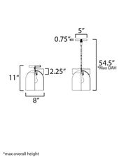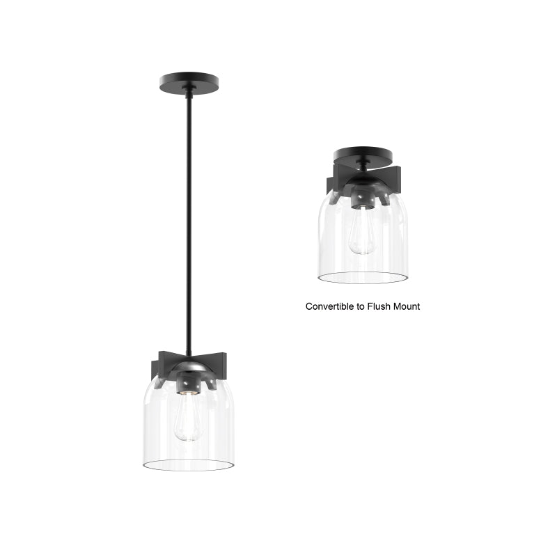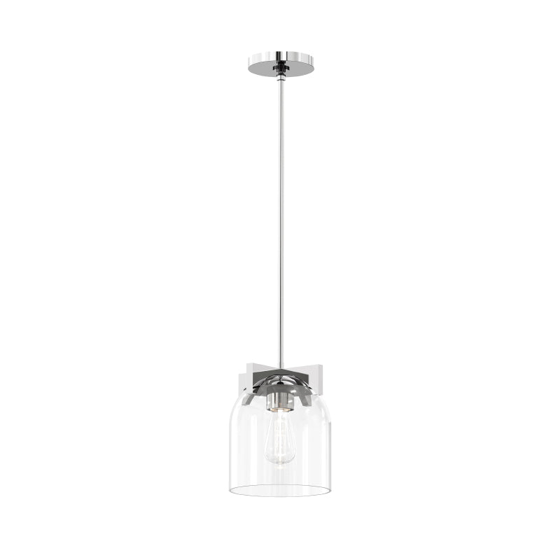Cut-out metalwork curves around modern bell-shaped glass shades. The series includes pendants and bath vanities available in either Clear or a swirling Marble glass.