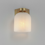 Undulating metalwork curves around modern bell-shaped glass shades fitted within the frame of these bath vanity sconces.