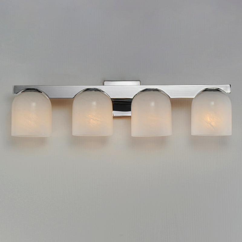 Undulating metalwork curves around modern bell-shaped glass shades fitted within the frame of these bath vanity sconces.