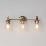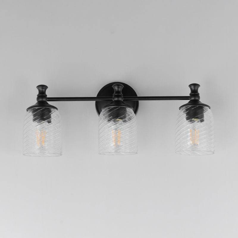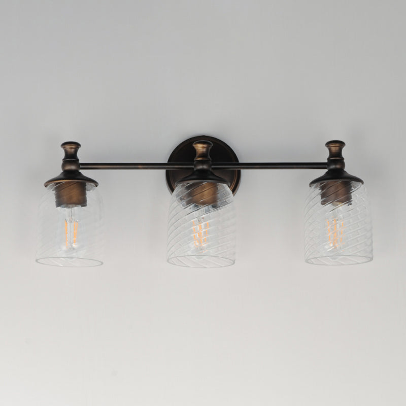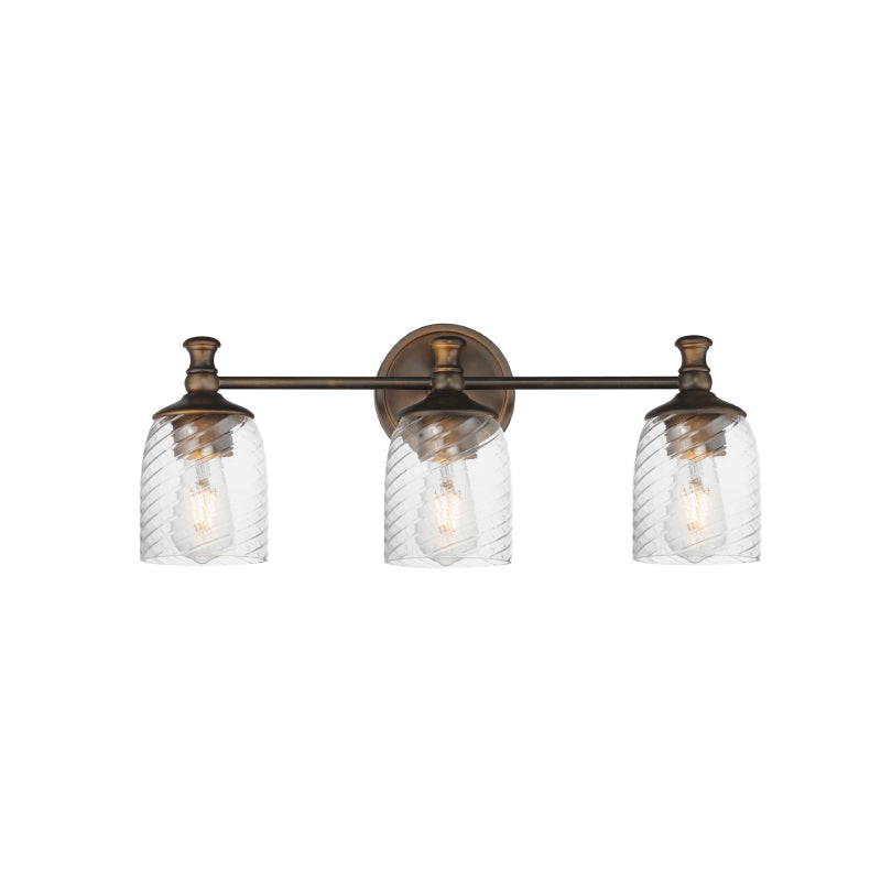 Traditional bell glass shades are reimagined with a swirling and fluted pattern. These Clear Ribbed glass shades are combined with traditional elements on the frame that complete the design.