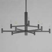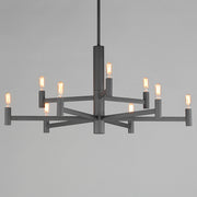 Straight extensions of rectilinear arms emanate from a cylindrical center housing in this transitional design. The candelabra is made in a corresponding cylindrical form playing into the geometries of this streamlined chandelier design.