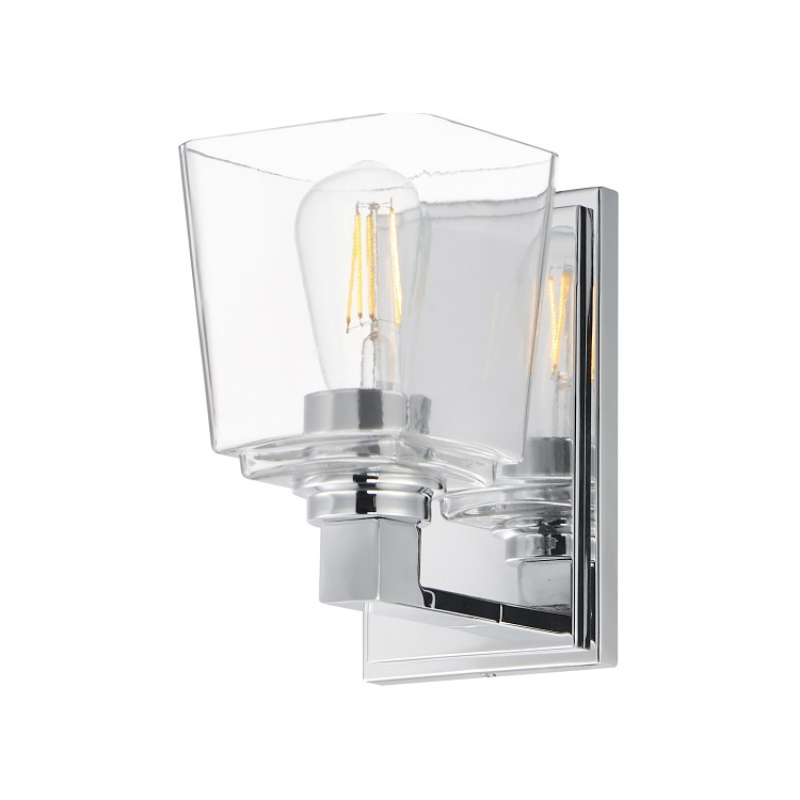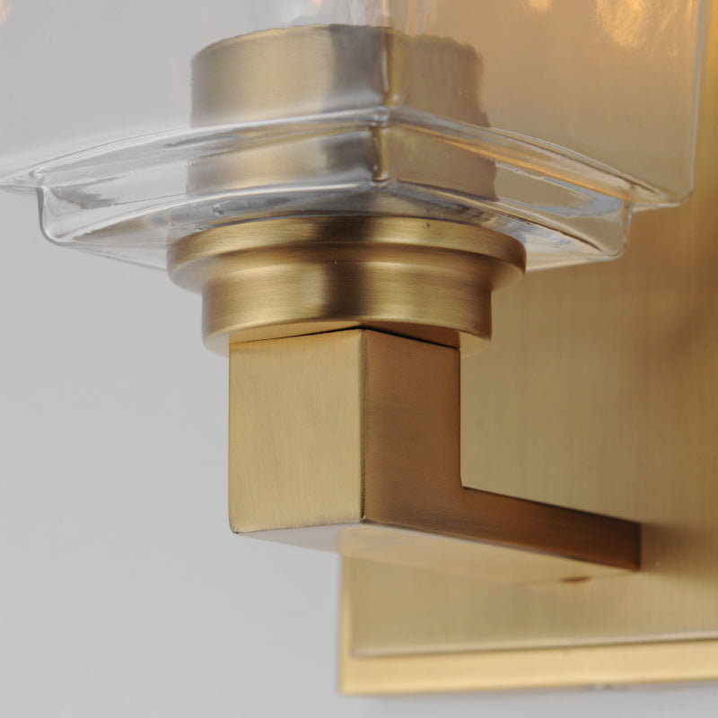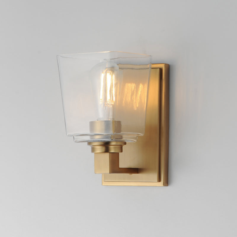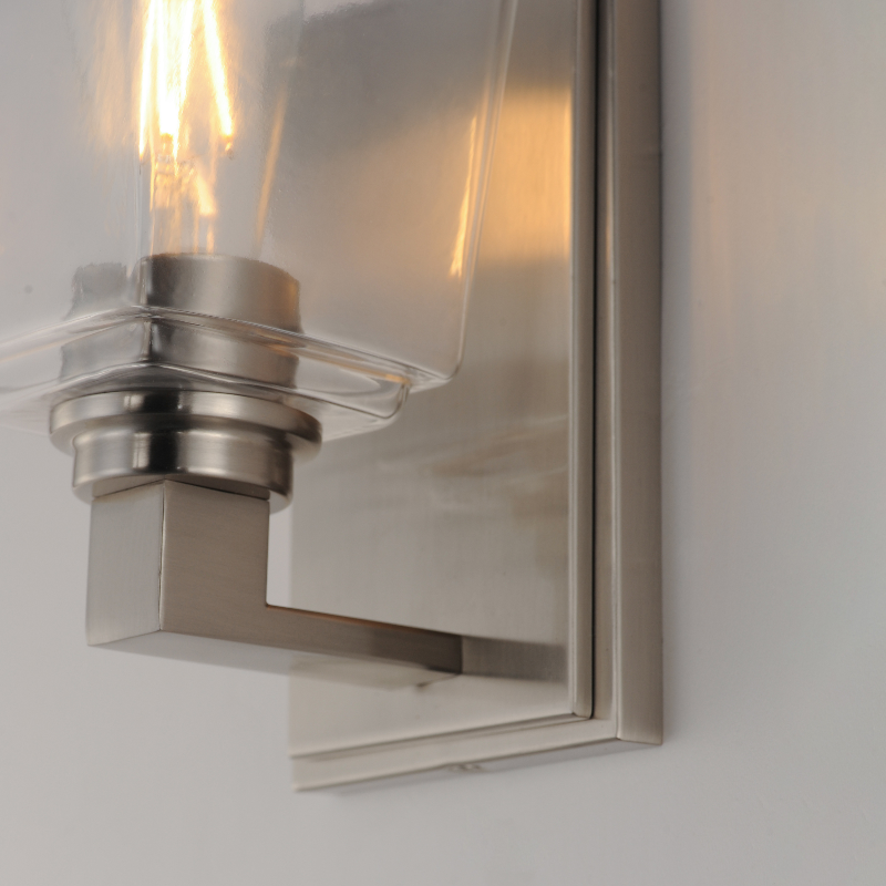 A composition of square forms that feature a Clear tapered square glass shade, these bath vanities provide a transitional design that suits both modern and traditional spaces.