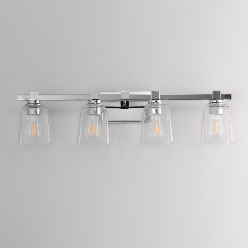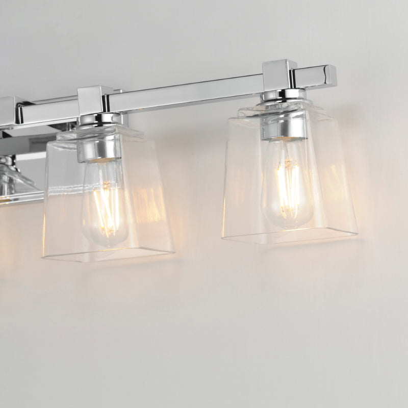 A composition of square forms that feature a Clear tapered square glass shade, these bath vanities provide a transitional design that suits both modern and traditional spaces.