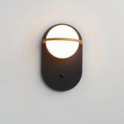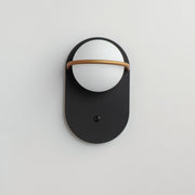 Satin White glass globes are nested behind rings of Gold which dramatically contrasts against the Black metal background. A bedside single sconce features a slim on/off rocker switch that adds convenience to the stylish design.