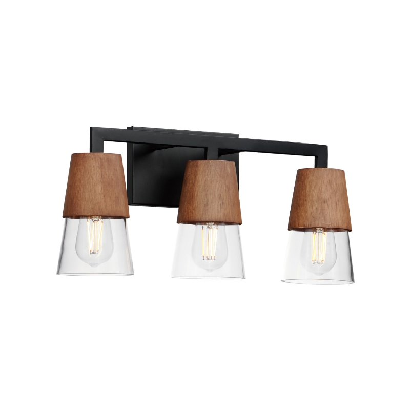 Capped by wood finished in Walnut, this series of bath vanity sconces feature conical Clear Glass shades. Contrasting Matte Black frames of squared tubing add clean geometry to the design. Use decorative lamps in the shades to complete the look.
