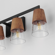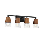 Capped by wood finished in Walnut, this series of bath vanity sconces feature conical Clear Glass shades. Contrasting Matte Black frames of squared tubing add clean geometry to the design. Use decorative lamps in the shades to complete the look.