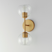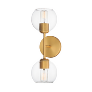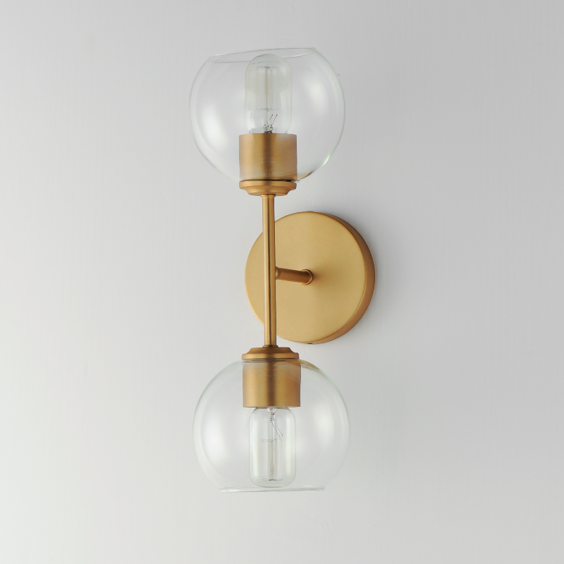 Clear glass globes on a Natural Aged Brass frame create a transitional design that is sure to please. The sloping arms level out to create a simple Mid Century Modern configuration. A full range of the products in this collection include chandeliers, pendants, flush mounts, and sconces.