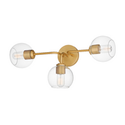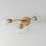 Clear glass globes on a Natural Aged Brass frame create a transitional design that is sure to please. The sloping arms level out to create a simple Mid Century Modern configuration. A full range of the products in this collection include chandeliers, pendants, flush mounts, and sconces.