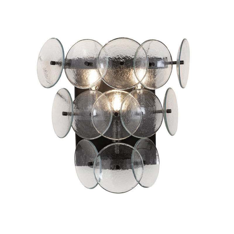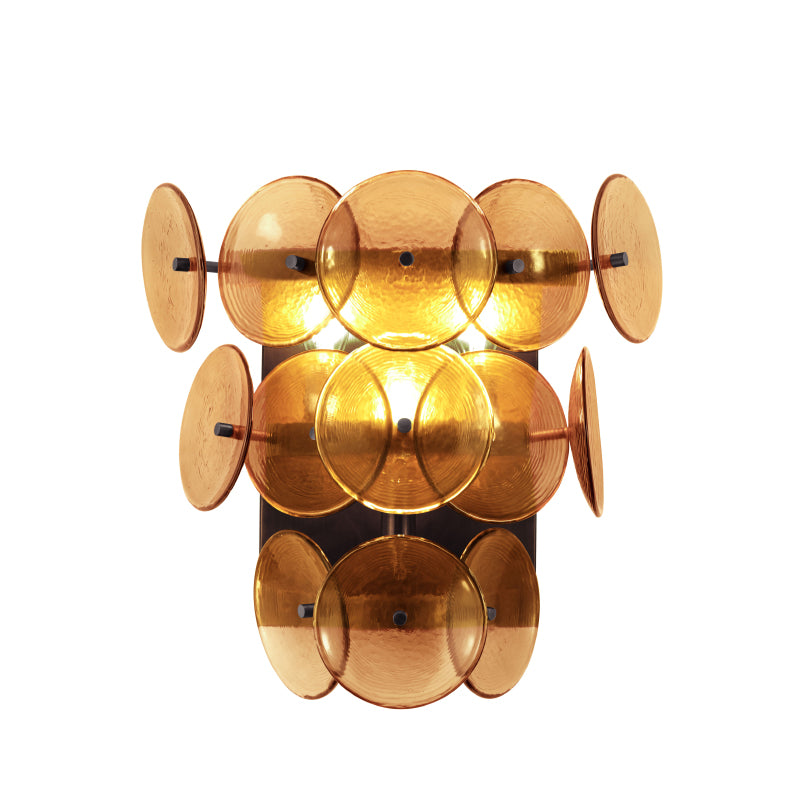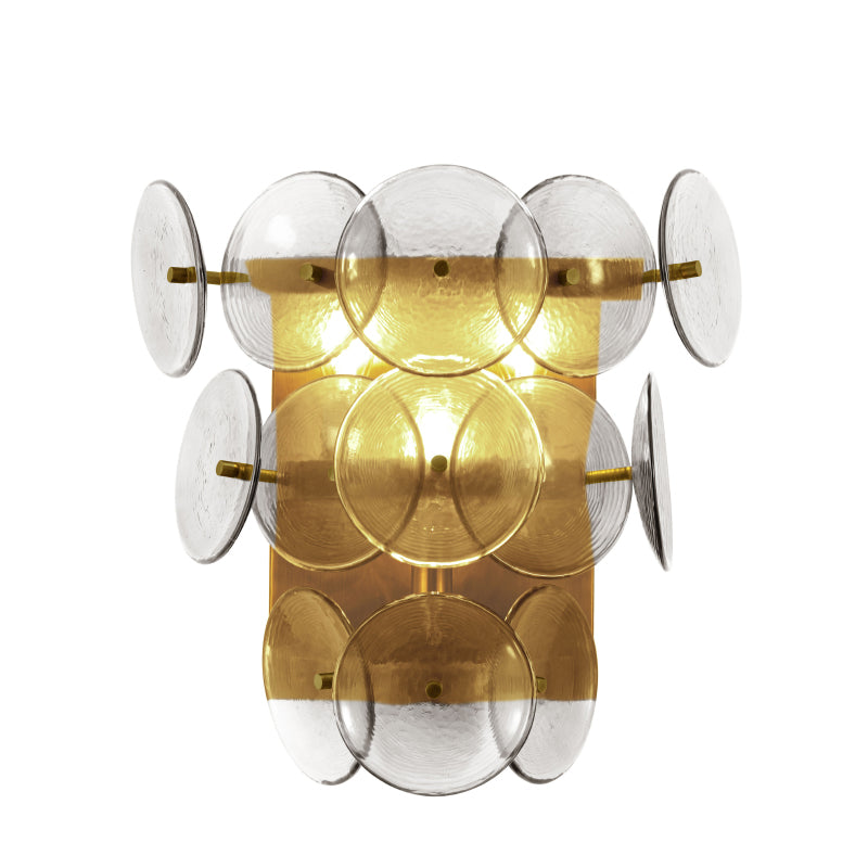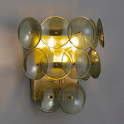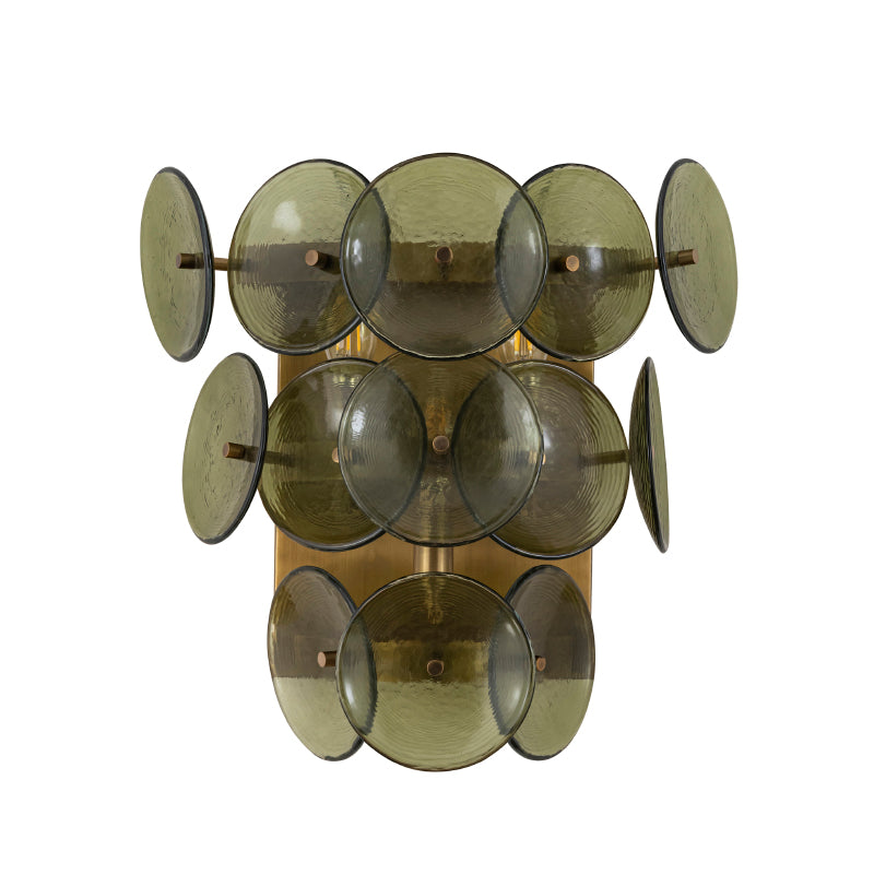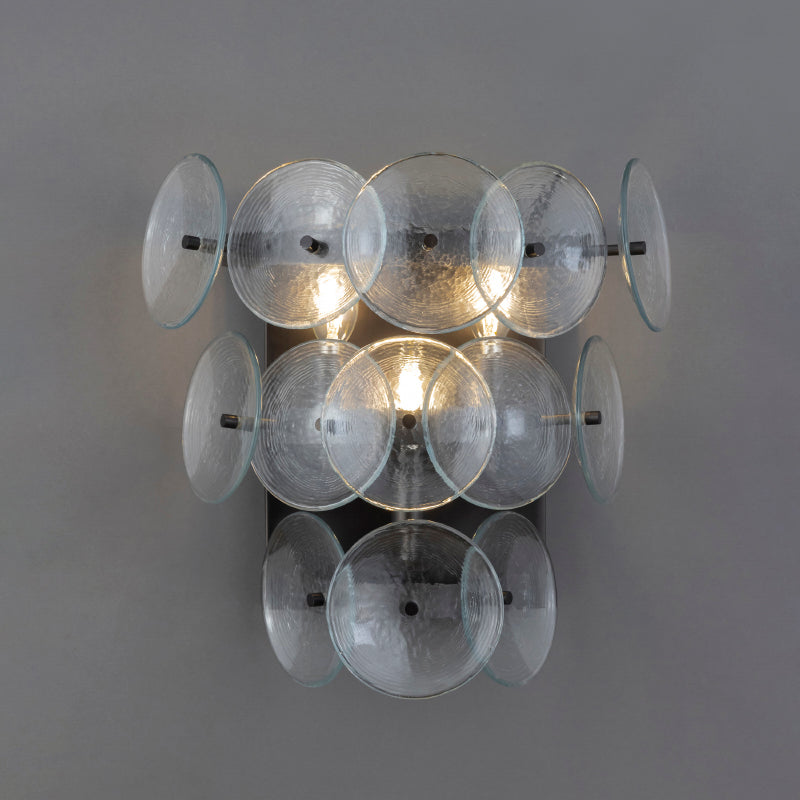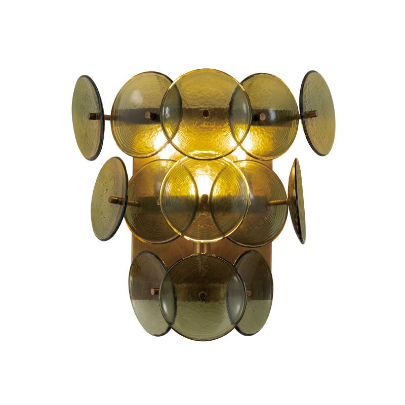 Overlapping handmade pressed glass disks mounted on metal frames inspired by Mid-Century Italian design, this collection offers a blend of vintage charm and modern elegance.