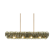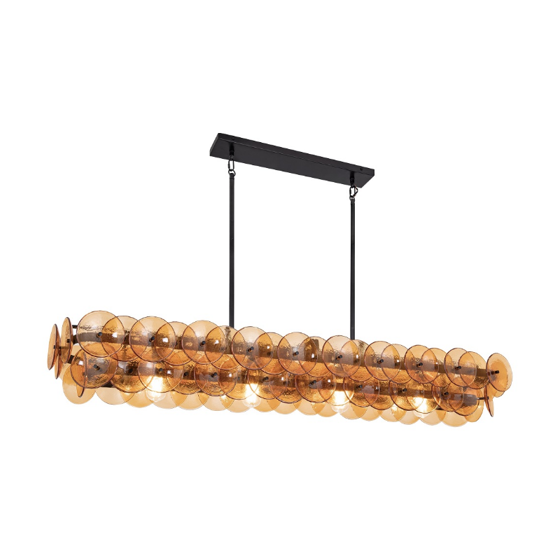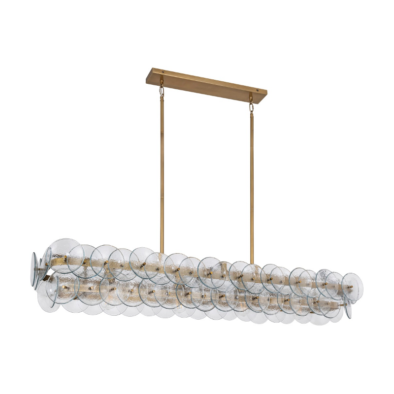 Overlapping handmade pressed glass disks mounted on metal frames inspired by Mid-Century Italian design, this collection offers a blend of vintage charm and modern elegance. Choose from Vintage Green glass on a Weathered Brass frame, or Amber glass on a Gunmetal frame, or Textured Clear glass on either frame.