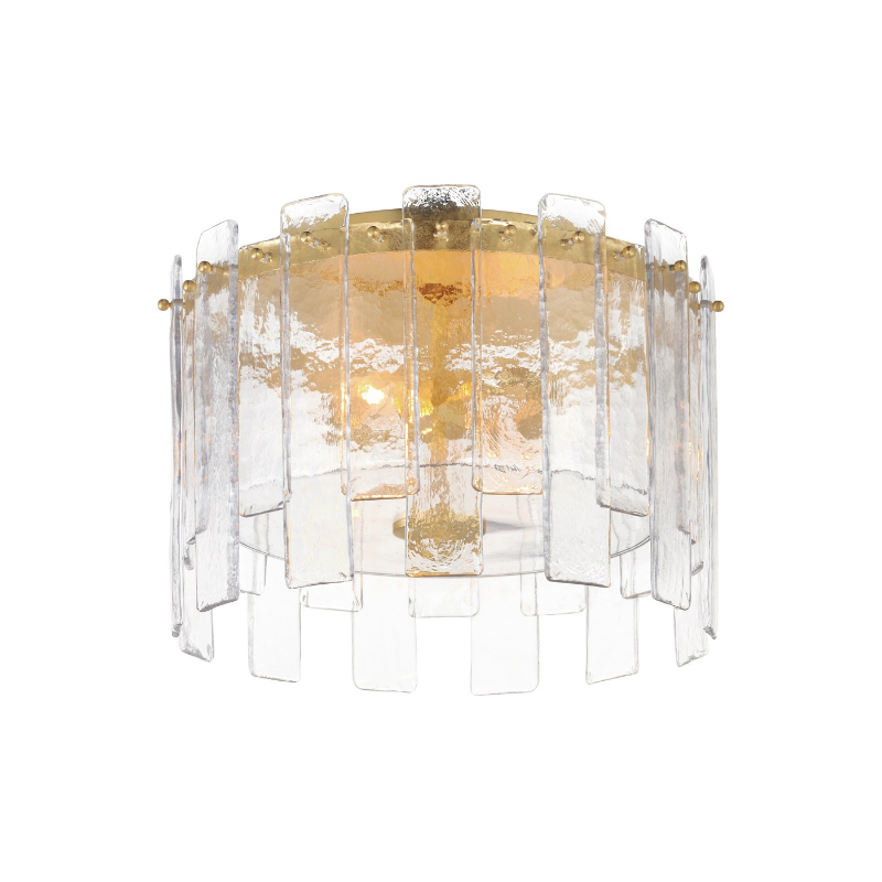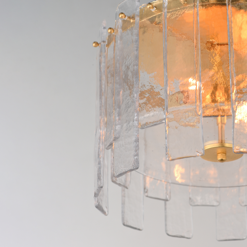 Sophisticated molten glass panels of distinctively organic character drape rings of Darkened Bronze metal. This attractive take on tiered glasswork pendants creates a warmer and moodier feel while also complementing a traditional contemporary style.