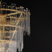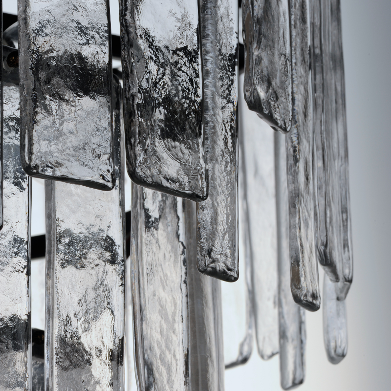 Gracefully flowing molten glass panels with a uniquely organic aesthetic encircle rings of rich Darkened Bronze metal or hand-applied Gold Leaf. This refined interpretation of tiered glass pendants exudes warmth and elegance, effortlessly blending a moody ambiance with timeless contemporary charm.