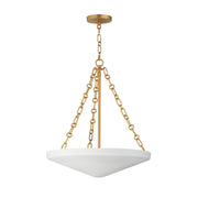 An inverted steel cone vessel painted in textured Plaster White gesso provides ambient lighting with classical styling. The stylized ring and oval chain links in Natural Aged Brass compliment the overall design.
