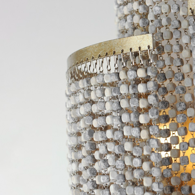 Cascading strands of square Weathered Wood beads are suspended on an offset spiraling frame finished in hand-applied Golden Silver leaf. The craftsmanship of the design is complimented by the soft glow of light within adding ambience to any space.