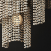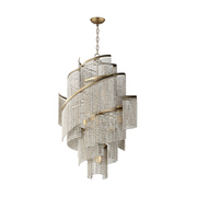 Cascading strands of square Weathered Wood beads are suspended on an offset spiraling frame finished in hand-applied Golden Silver leaf. The craftsmanship of the design is complimented by the soft glow of light within adding ambience to any space.