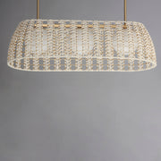 Varied cotton ropes in an Off-White finish are hand woven in a decorative pattern along a metal frame finished in Gold. Housed within these artisanal shades, Satin White glass globes softly diffuse enclosed lamps.
