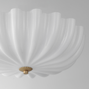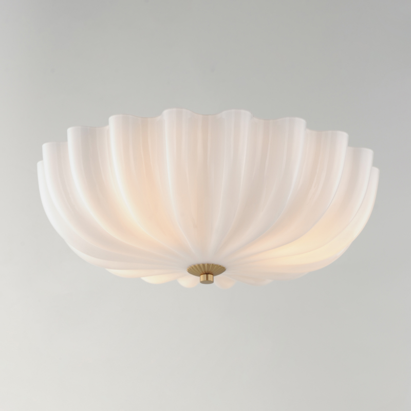 With glossy opal white glass shades, this collection brings a graceful, feminine touch to the inverted bowl design inspired by the shape of a bundt cake. Suspended by a decorative circular ring chain, the shade features an acrylic dust cover that encloses the top, keeping the glass pristine.