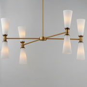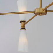 Fluted Satin White glass flares outward from an intricate and thin arm. The contrasting Natural Aged Brass and Matte Black finish adds character to the simple and stately fixtures that easily transition from modern and more traditional spaces.