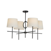 A clean frame with an oversized ring detail is finished in Charcoal Bronze. Featuring oversized Off-White Linen shades on two configurations of pendants, the collection also includes a two-tier chandelier and wall sconce.