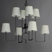 A clean frame with an oversized ring detail is finished in Charcoal Bronze. Featuring oversized Off-White Linen shades on two configurations of pendants, the collection also includes a two-tier chandelier and wall sconce.