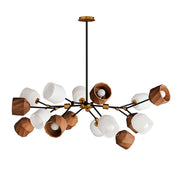 This fashionable modern chandelier combines solid wood shades with warm bronze and brass tones. Posing with arms akimbo, a combination of walnut stained oak and Satin White glass shades creates a transitional statement in mixed materials while also providing pleasant glare-free lighting.
