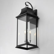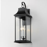 Inspired by classic coach gas lanterns, the Vicksburg collection features die-cast aluminum construction finished in Black with Clear glass. The candle sleeves are done in a contrasting off-white finish to add dimension to the lantern.