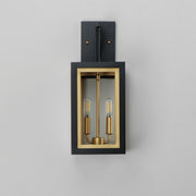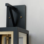 Two-tone frames of Black or White with internal Gold frames provides a neoclassical approach to the squared coach lantern. The sconces jut out from the wall on well-defined trusses that add a contemporary element. Delivering a classic design that suits most exteriors, this collection adds interest in the interior contrasting frame of Gold that secures clear glass panes to diffuse the lamp within.