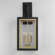Two-tone frames of Black or White with internal Gold frames provides a neoclassical approach to the squared coach lantern. The sconces jut out from the wall on well-defined trusses that add a contemporary element. Delivering a classic design that suits most exteriors, this collection adds interest in the interior contrasting frame of Gold that secures clear glass panes to diffuse the lamp within.