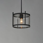 Squared columns in Matte Black finish tower above the cylindrical glass shade rated for outdoor applications. A rectangular hook detail carries the square form through to the backplate. A modern interpretation of a bell tower, these outdoor pendants and sconces are a cleaned up, transitional look for exteriors.