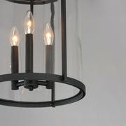 Squared columns in Matte Black finish tower above the cylindrical glass shade rated for outdoor applications. A rectangular hook detail carries the square form through to the backplate. A modern interpretation of a bell tower, these outdoor pendants and sconces are a cleaned up, transitional look for exteriors.