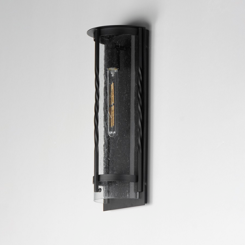 Forged iron spindles twist along the frame of a half round sconce. Transitional in design, they are finished in a Neutral Black outdoor rated powder coat and feature Clear Seeded glass. Use tubular lamps to accentuate the height of the sconces.