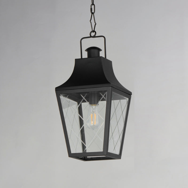 These charming cottage style lanterns feature unique cross-etched glass panels that are Clear and beveled along their edges. Additional design details such as whimsical loops above a chimney element add to the product's delightful appearance.