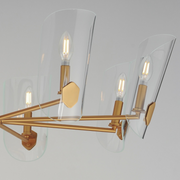 A Coat of Arms in curved Clear glass shades bevel cut and shaped to resemble traditional shields radiates off slender tubular arms. The streamlined design takes on a transitional approach with imaginative details that carries through to the concept for the wall sconce.
