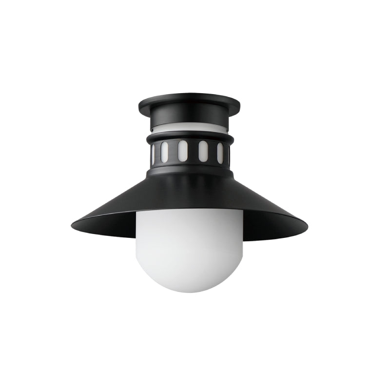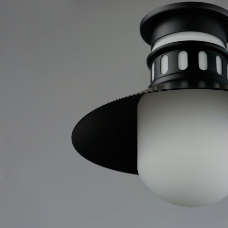 Coastally inspired, the wide brimmed aluminum spun shade on this series of outdoor rated sconces, pendants, and flush mounts features a tiered shade design. The ringed separation features a filigree of oval cut outs, whereby a single lamp illuminates the Satin White glass supporting it. The resulting light is dispersed both above and below the spun shade as well as through the patterned filigree. Both modern and classic homes can appreciate this classic design reimagined.