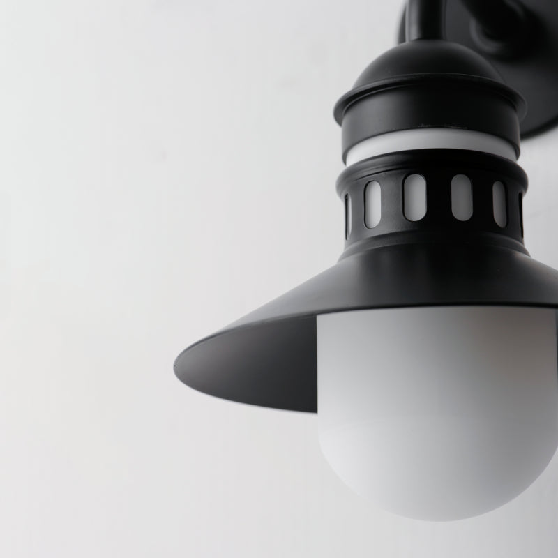 Coastally inspired, the wide brimmed aluminum spun shade on this series of outdoor rated sconces, pendants, and flush mounts features a tiered shade design. The ringed separation features a filigree of oval cut outs, whereby a single lamp illuminates the Satin White glass supporting it. The resulting light is dispersed both above and below the spun shade as well as through the patterned filigree. Both modern and classic homes can appreciate this classic design reimagined.