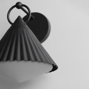Adding charm to the outdoors, the Odette series features a scalloped pyramid shade suspended from a ring of Die Cast Aluminum. Supported within the shade is an inverse pyramid that peaks out beneath the hem of the aluminum shade marrying the two pyramid forms. Graceful and playful, these outdoor sconces add the designer touch to both indoor and outdoor locations.